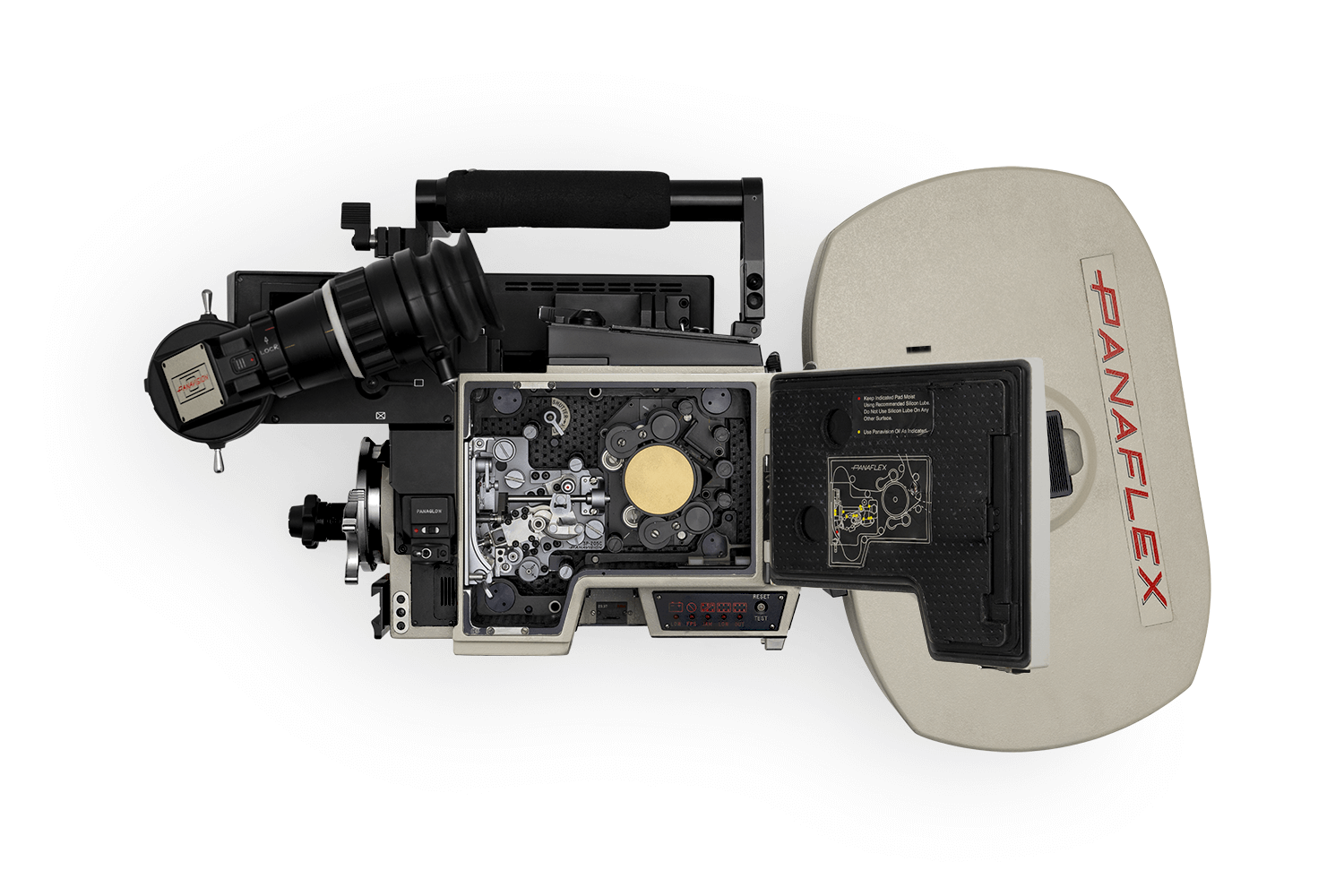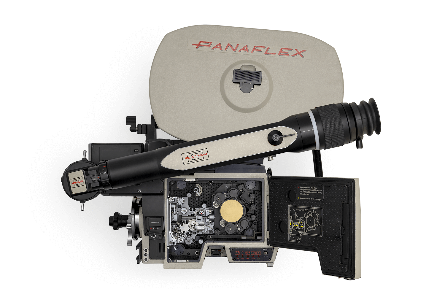 Designed for sync-sound acquisition, the Panaflex Platinum 35mm film camera evolved out of the earlier GII Golden Panaflex. The crystal-controlled motor is adjustable in increments of 1/10 fps, and the shutter is adjustable — even during a take — from 50° to 200° in 1/10-degree increments. A dual-sided LCD display allows at-a-glance checks of footage, film speed and shutter angle. Film mags can be top- or rear-mounted, and a perforation-locating pin above the aperture enables fast and easy film threading.